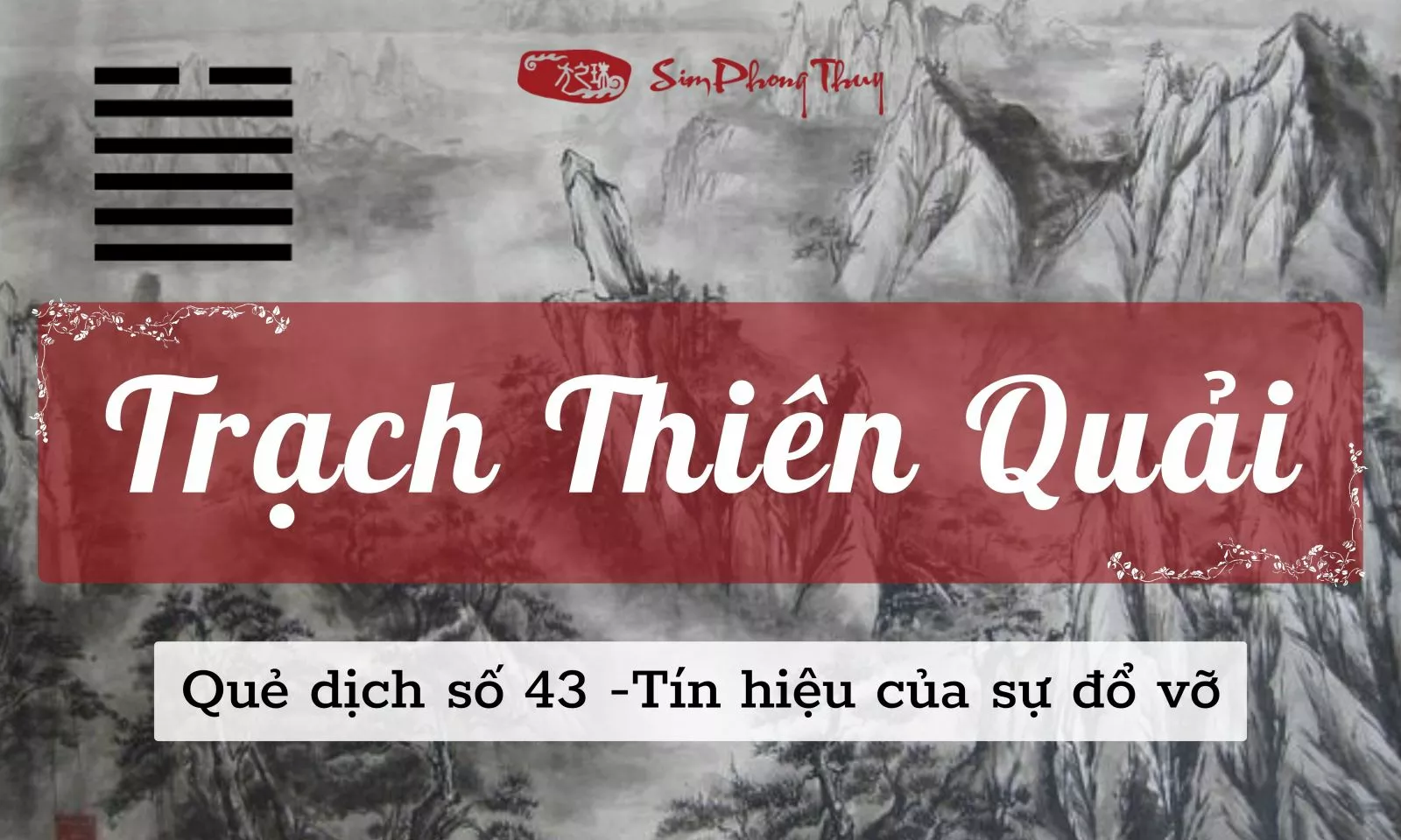 Quẻ Trạch Thiên Quải chủ về thời kỳ Dương thịnh Âm suy báo điềm trung bình. Tình thế cần hết sức cẩn trọng trong mọi hành động mới tránh được những sai lầm. Thời này công danh sự nghiệp khó thành, tài vận kinh doanh không có, thi cử khó đạt được kết quả như ý. Song, quẻ số 43 chiêm báo tình duyên không xứng đôi, khó đi đến chuyện hôn nhân đại sự. Nếu có thì cuộc sống cũng không được tốt mà đi đến sự chia lìa không mong muốn. Gia đạo gặp nhiều vấn đề mâu thuẫn, khó vượt qua.