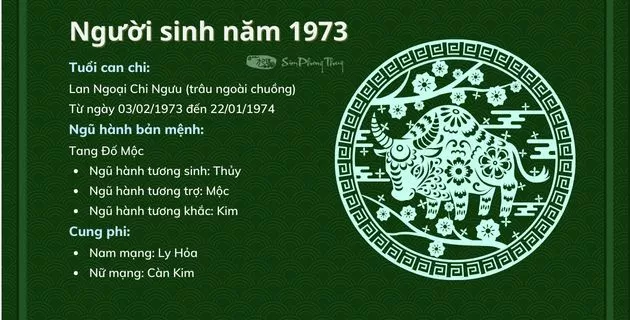 Số hợp tuổi theo mệnh niên: Người sinh năm 1973 ngũ hành nạp âm Tang Đố Mộc nên sẽ hợp với các con số thuộc ngũ hành Thủy (tốt nhất) và ngũ hành Mộc (khá tốt). Cụ thể số hợp tuổi 1973 theo mệnh niên gồm: số 0, số 3 và số 4.
