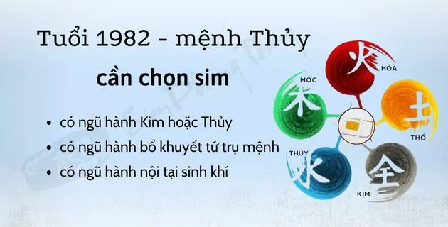 Sim hợp tuổi 1982 phải có "nội tại số sim sinh khí" tức ngũ hành của con số trong sim tính từ trái qua phải tương sinh nhiều hơn xung khắc. Trong đó ngũ hành của con số trong sim là hành Thổ (số 5, số 6), hành Kim (số 7, số 8), hành Thủy (số 0, số 9), hành Mộc (số 1, số 2) và hành Hỏa (số 3, số 4).